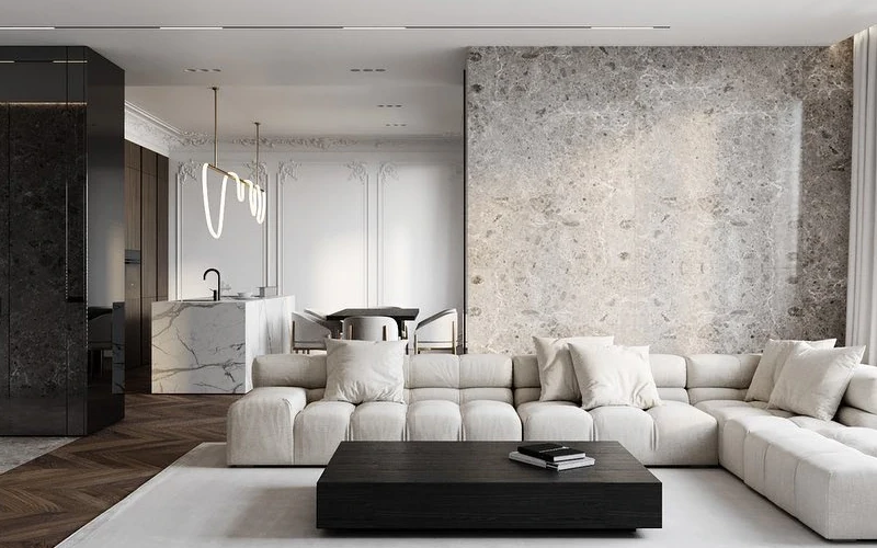 Например, молдинги в современном интерьере гостиной могут быть окрашены в цвет стены, создавая едва заметную рамку, которая делает пространство собранным. В скандинавском стиле они добавляют объём светлым стенам, а в лофте — выделяют фактурные участки, не нарушая стилистику.
