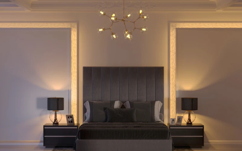 Пример из практики: в интерьере спальни рамки из тонкого гипсового молдинга в цвет стены придают мягкость и делают комнату визуально выше.