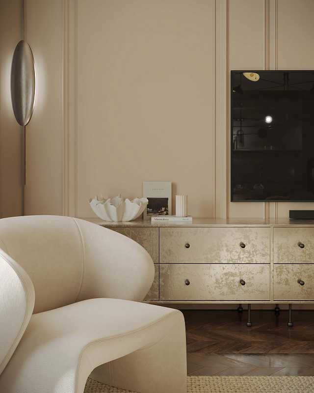 Интерьер выполнен в современном стиле с акцентом на комфорт, эстетичность и внимание к деталям. Пространство создает ощущение уюта и гармонии за счёт спокойных тонов, благородных фактур и сбалансированного сочетания форм и объемов.