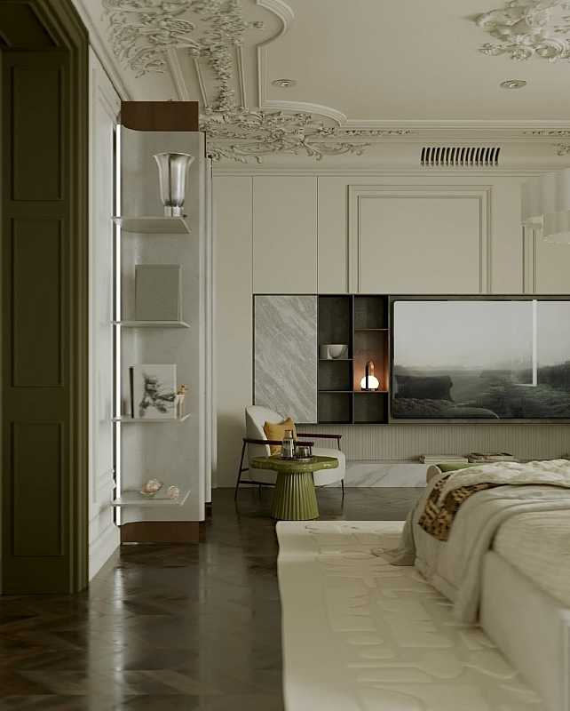 – Лаконичная и функциональная ТВ-зона с нишами для декора и книг, добавляющая архитектурной графики и уюта.