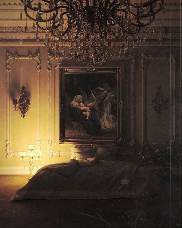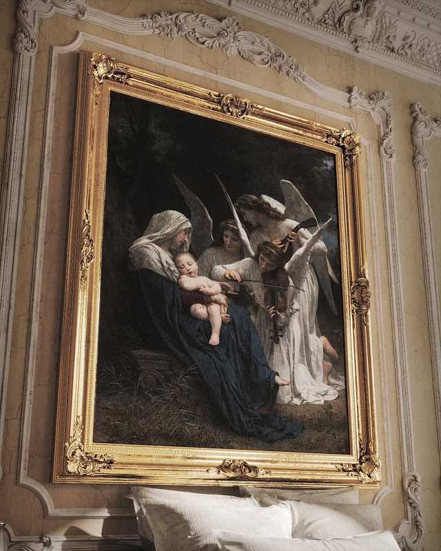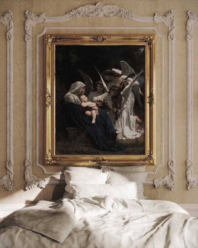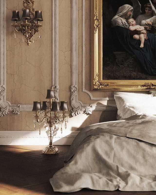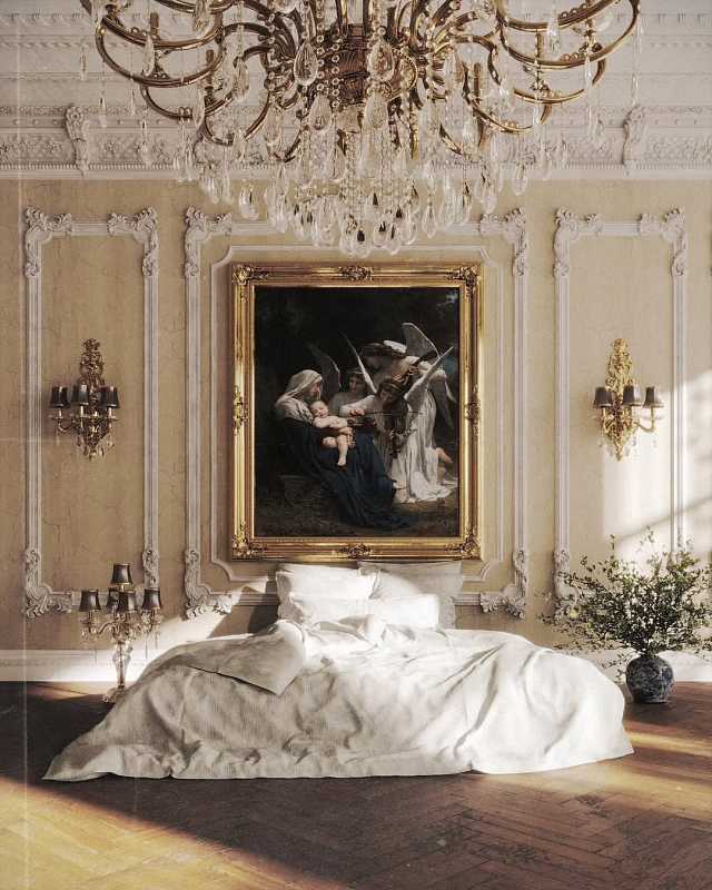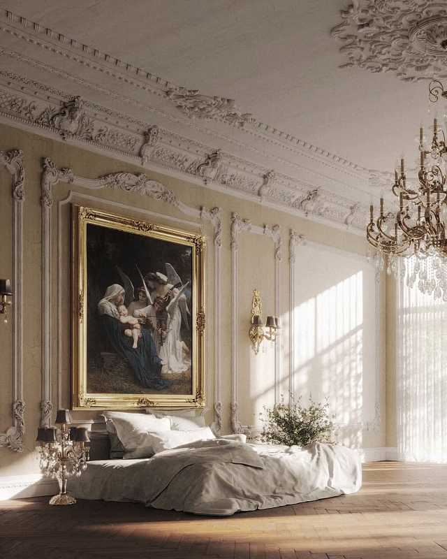 Эта спальня воплощает атмосферу дворцовой элегантности и утончённого искусства. Пространство построено на торжественной архитектуре и богатом декоративном убранстве: высокий потолок, лепнина с изысканным рисунком и крупное произведение живописи в золочёной раме становятся ключевыми акцентами интерьера.