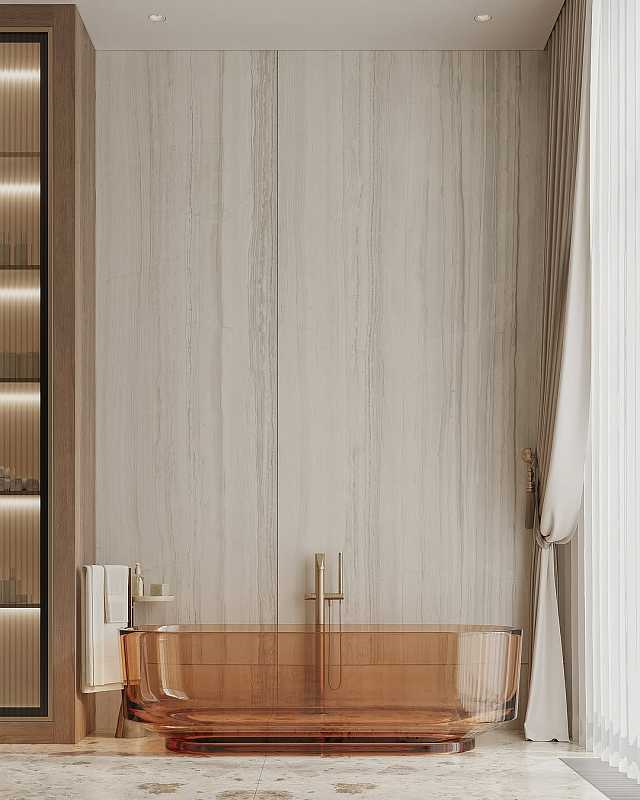 – Прозрачная ванна карамельного оттенка стала визуальным акцентом интерьера — словно скульптура, она притягивает взгляд и задаёт настроение всему пространству.
